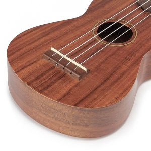 | Localizado sob as cordas na parte superior do corpo do ukulele, o buraco do som permite que o som criado dentro do ukulele seja amplificado e projetado. | Como a pestana, o rastilho controla a altura e o espaçamento das cordas e transfere suas vibrações através da ponte para o topo do ukulele. | As cordas são presas ao corpo do ukulele pela ponte. A ponte transmite as vibrações das cordas ao serem tocadas para o topo do ukulele. |